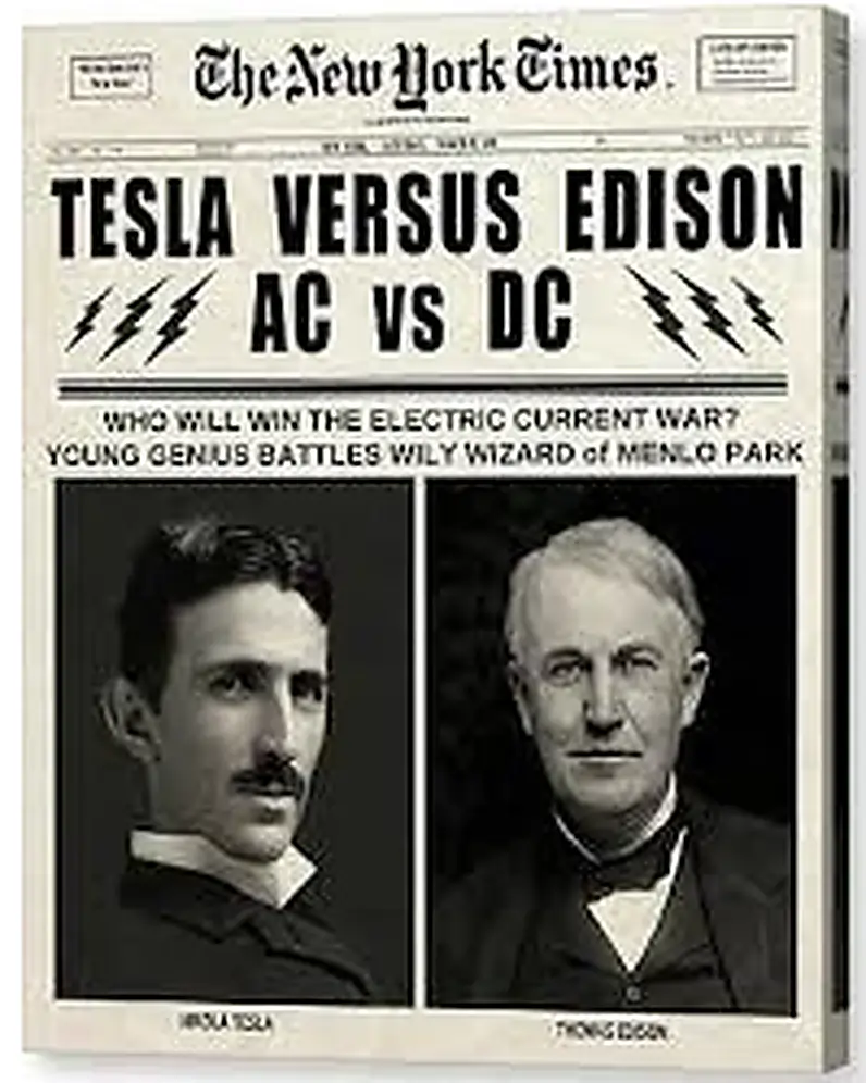 “Un artículo de The New York Post de principios de 1900 destacaba la famosa rivalidad entre Nikola Tesla y Thomas Edison — una batalla entre la corriente alterna y la continua que todavía hoy da forma a nuestras facturas de electricidad.”
